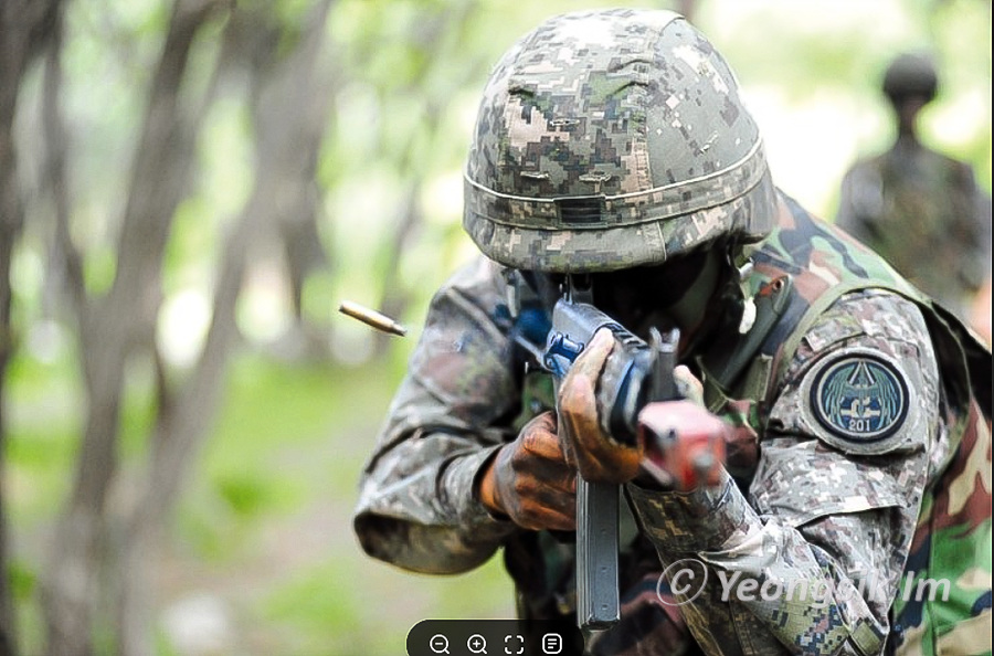 패스트로프와 연계한 수색정잘 전투사격 훈련 중 적이 출연하자 신속하게 은퍠한 후 대응사격하고 있다. 사진 임영식기자